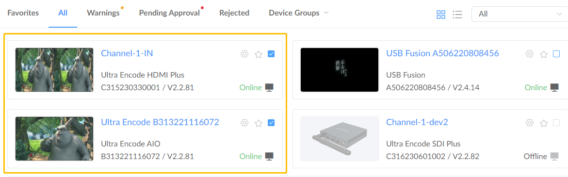 All hosted devices are listed in the page. - Choose one or more devices to perform the following operations.