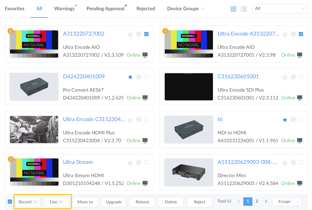 - choose one or more devices from the page, and start/stop the Record or Live sessions of the chosen devices.
