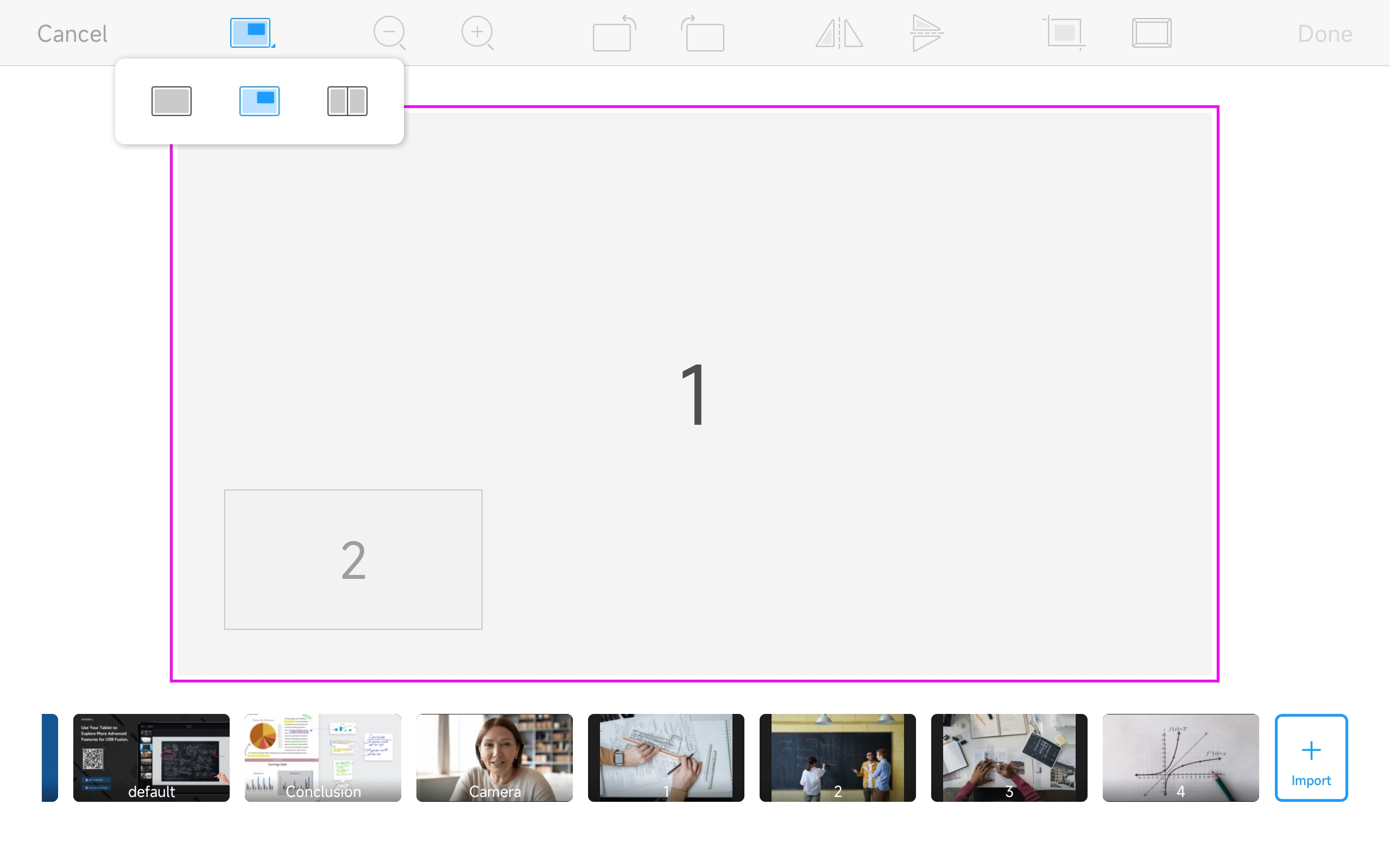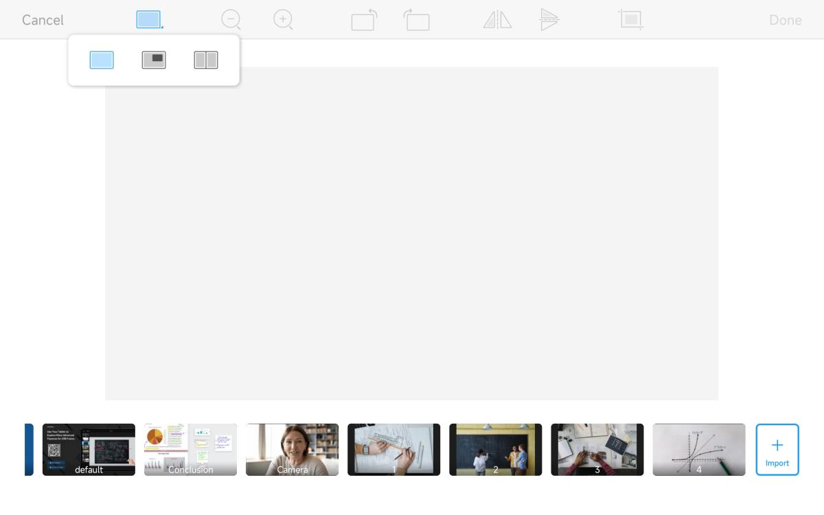 The cropping tool can crop out unnecessary parts of a source, or crop it to a desired aspect ratio. It provides three common aspect ratios (4:3, 16:9 and 1:1) for quick cropping. Note that if you re-enter the cropping page for a second time after previously cropping, you will again be cropping based on the original source.
