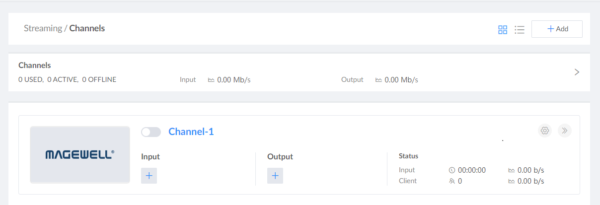 - Here we create a channel named Channel‐1, and add a device named Channel‐1‐in as input, Channel‐1‐out as output. The input and output streams use default(RTMP) protocol.