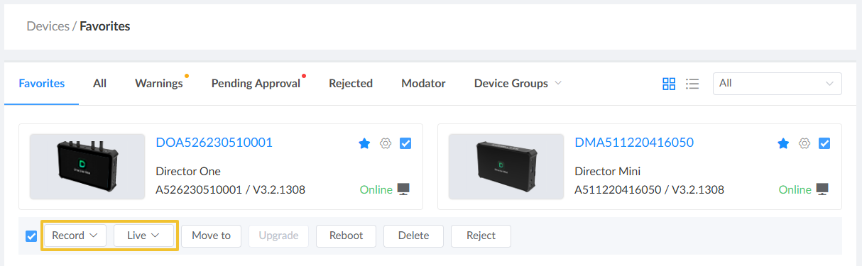 - Choose one or more devices from the page, and start/stop the Record or Live sessions of the chosen devices. The devices should support the Record or Live function, such as Ultra Stream and Director series.