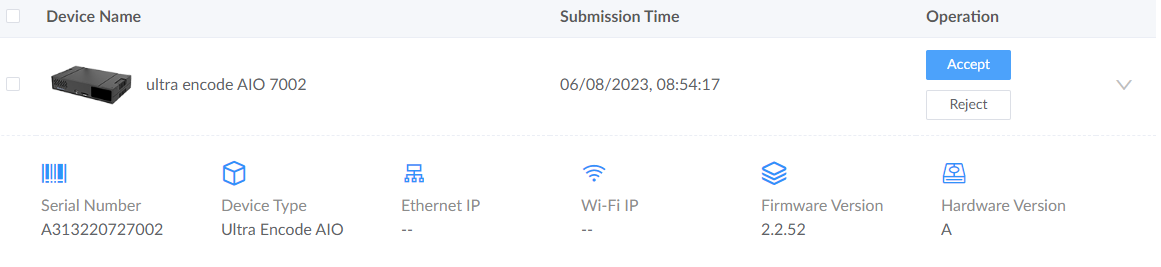 check serial number, device type, Ethernet IP address, firmware version and hardware version.