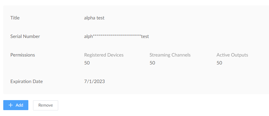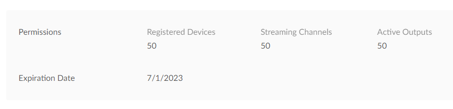 - Check permissions of Registered Devices, Streaming Channels, Active Outputs and Expiration Date.