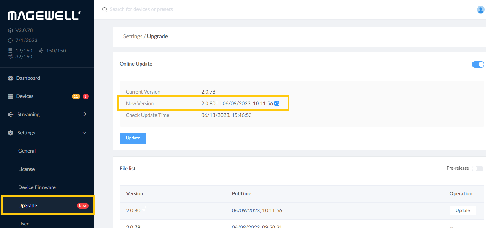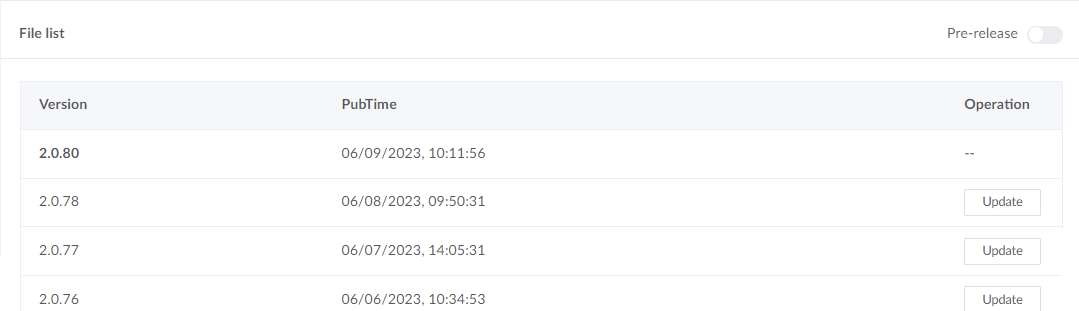 - Click  icon to check for the latest version manually. icon to check for the latest version manually.The latest version files detected will list in the File List section.  Pre-release version