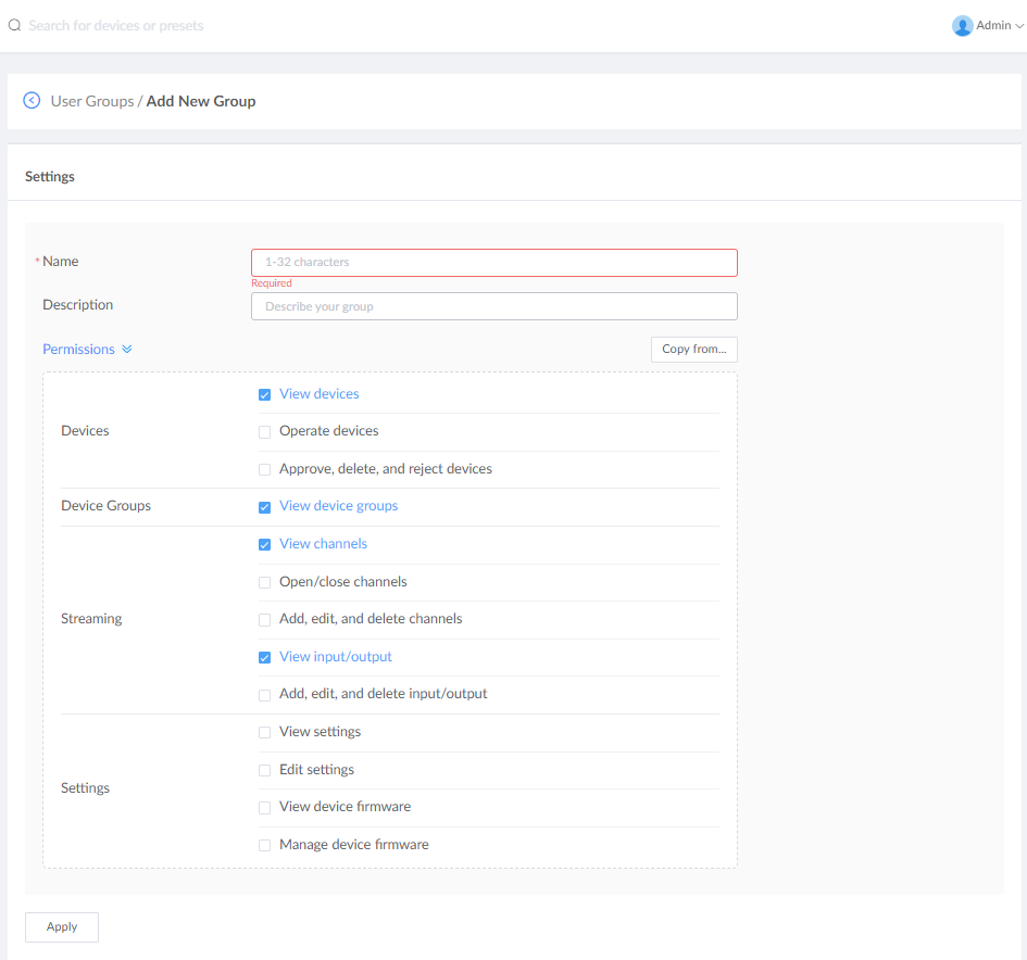 - Click + Add New Group, and input Name, Description, and specify permissions for the group, then click Apply.