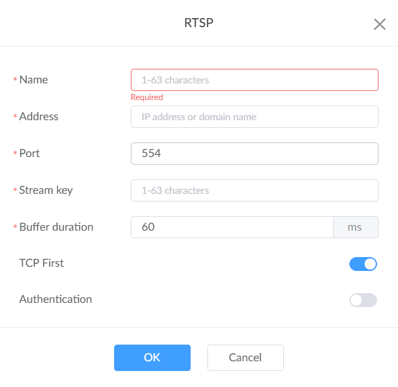 - Authentication: Turn on the switch as required by the input source, and enter the username and password. It is disabled by default.