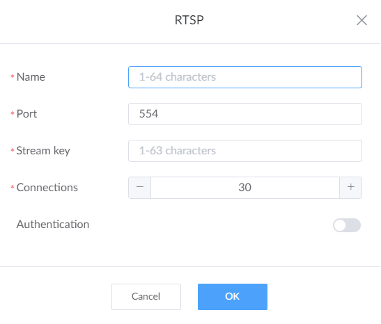 - Connections: set number of clients for RTSP, 1 to 50 clients are supported. By default, it is 30.