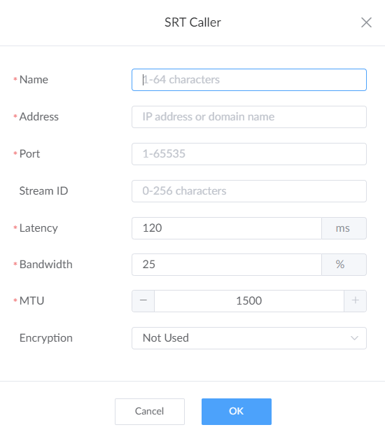 - Stream ID: available for SRT Caller. 0 to 256 characters which should be consistent with that of its destination's.