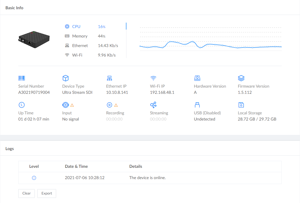 - Working status includes up time, status of input port, recording, streaming, USB recording and local recording.