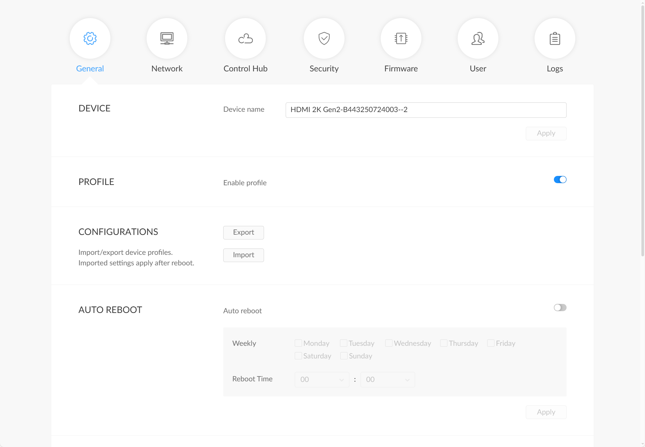 - To import a configuration file: In the Configurations section, click the Import button, and select a bin-format configuration file to import into the device. After a successful import, restart the device to apply the new configuration.