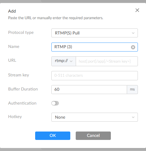 - URL: Enter the RTMP source URL.