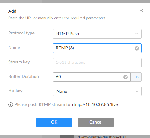 Buffer Duration: Range 1–5000 ms, default 60 ms. To ensure smooth video output, it is recommended that the buffer time is longer than the Jitter time displayed in Dashboard. You can reduce the buffer time when the task has high low-latency requirements. Use the default value if there are no special requirements.