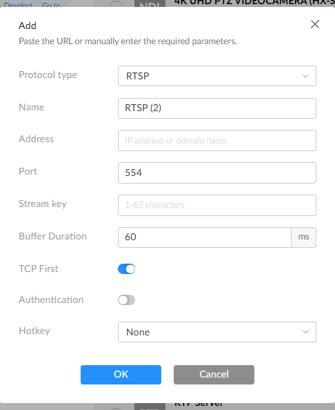 - Stream Key: Enter the stream password for access authentication. Range: 0 - 127 characters.